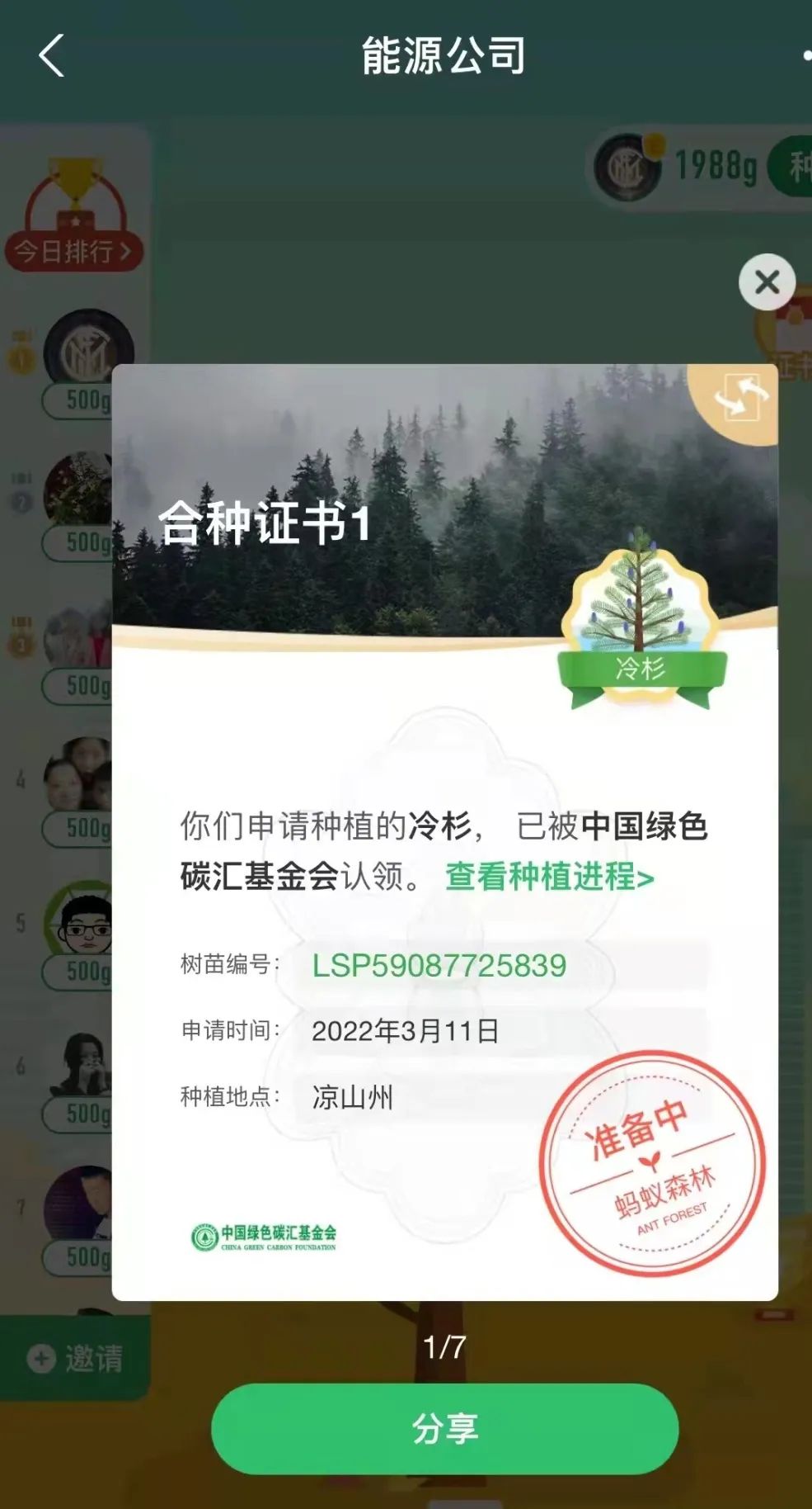 “一花一草皆生命,一枝一葉總關(guān)情。”早在2019年起,公司就通過支付寶螞蟻森林組建了一只“能源公司云種樹小隊(duì)”,如今隊(duì)伍人數(shù)越來越壯大,已有59位隊(duì)員,截止目前,在酒泉、大理、邯鄲等地,種下了冷杉、側(cè)柏、云杉、胡楊等7棵大樹。3月11日,在小伙伴的共同努力下,我們又種下了一棵冷杉樹,該樹被中國綠色碳匯基金會認(rèn)領(lǐng),將種植到?jīng)錾街莸貐^(qū)。